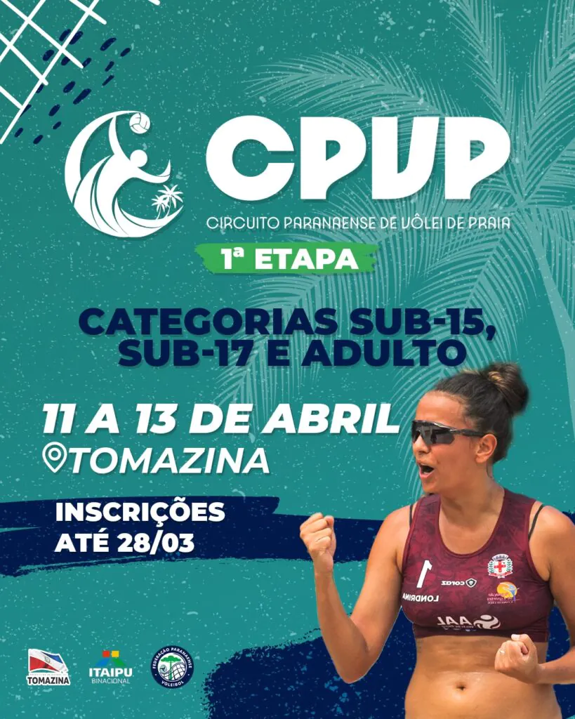 Estão abertas as inscrições para a primeira etapa do Circuito Paranaense de Vôlei de Praia (CPVP) 2025. A competição está marcada para acontecer entre os dias 11 e 13 de abril, no Parque das Corredeiras, em Tomazina, nas categorias Sub-15, Sub-17 e Adulto, ambos os naipes. As inscrições encerram no dia 1º de abril.
