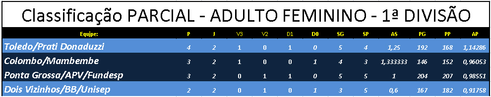 Depois de perder na estreia para Ponta Grossa, Toledo/Prati Donaduzzi venceu Colombo/Mambembe por 3 sets a 1 (15/25, 25/17, 25/11 e 25/18). Com a vitória, as representantes do oeste chegaram a quatro ponto e vão para a liderança, enquanto a equipe da região Metropolitana que venceu na estreia Dois Vizinhos, soma três pontos.