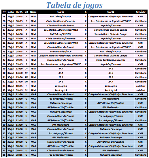 A Federação Paranaense de Voleibol (FPV) convidou as equipes do Santa Mônica Clube de Campo e do CataratasVôlei/Itaipu Binacional para integrarem o quadro de participantes do Campeonato Estadual Sub-17 nos naipes feminino e masculino, respectivamente. O torneio acontece em Curitiba, entre 29 e 31 de julho nos ginásios do Círculo Militar e do Clube Curitibano.