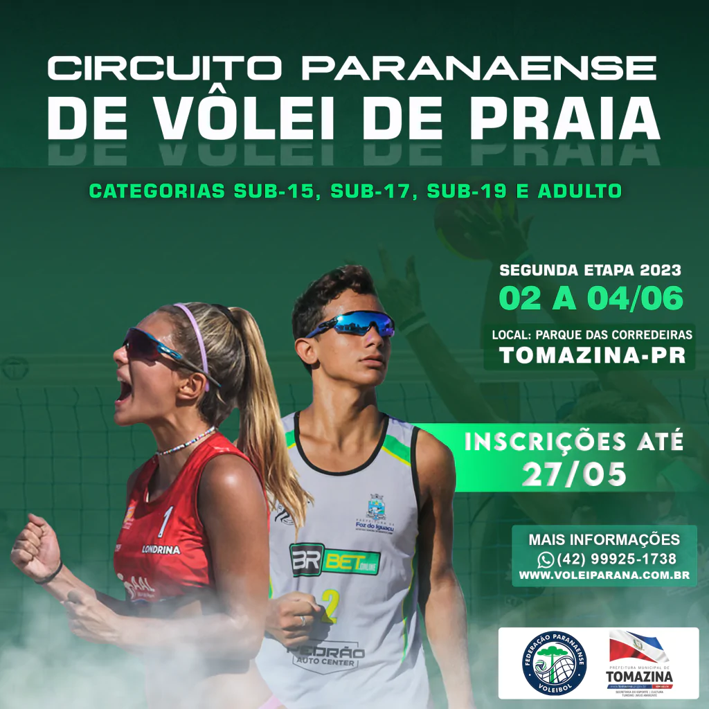 Estão abertas as inscrições para a segunda etapa do Circuito Paranaense de Vôlei de Praia (CPVP) 2023. A competição está marcada para acontecer entre os dias 02 e 04 de junho no Parque das Corredeiras, em Tomazina, região Norte Pioneiro, nas categorias Sub-15, Sub-17, Sub-19 e Adulto, ambos os naipes. As inscrições encerram no dia 27 de maio.