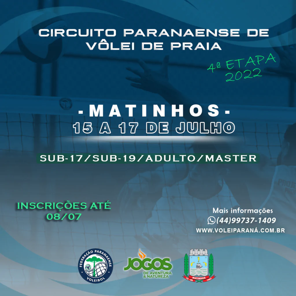Estão abertas as inscrições para a quarta etapa do Circuito Paranaense de Vôlei de Praia (CPVP). A competição está marcada para acontecer entre os dias 15 a 17 julho, em Matinhos, nas categorias Sub-17, Sub-19, Adulto e Master (Feminino 40+ e Masculino 45+), ambos os naipes.