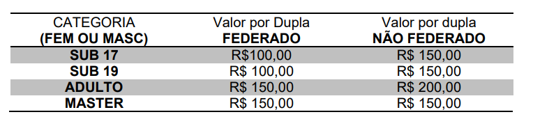 Entende-se por federado a dupla que estiver devidamente registrada no Paraná e com o registro atualizado no ano de 2022 até a data de inscrição (08 de julho). Os demais se enquadram em não federados.