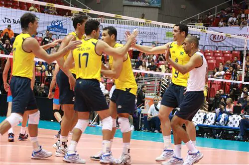 BRASIL – Bruno, Leandro Vissotto, Murilo, Giba, Lucas e Sidão. Líbero – Serginho