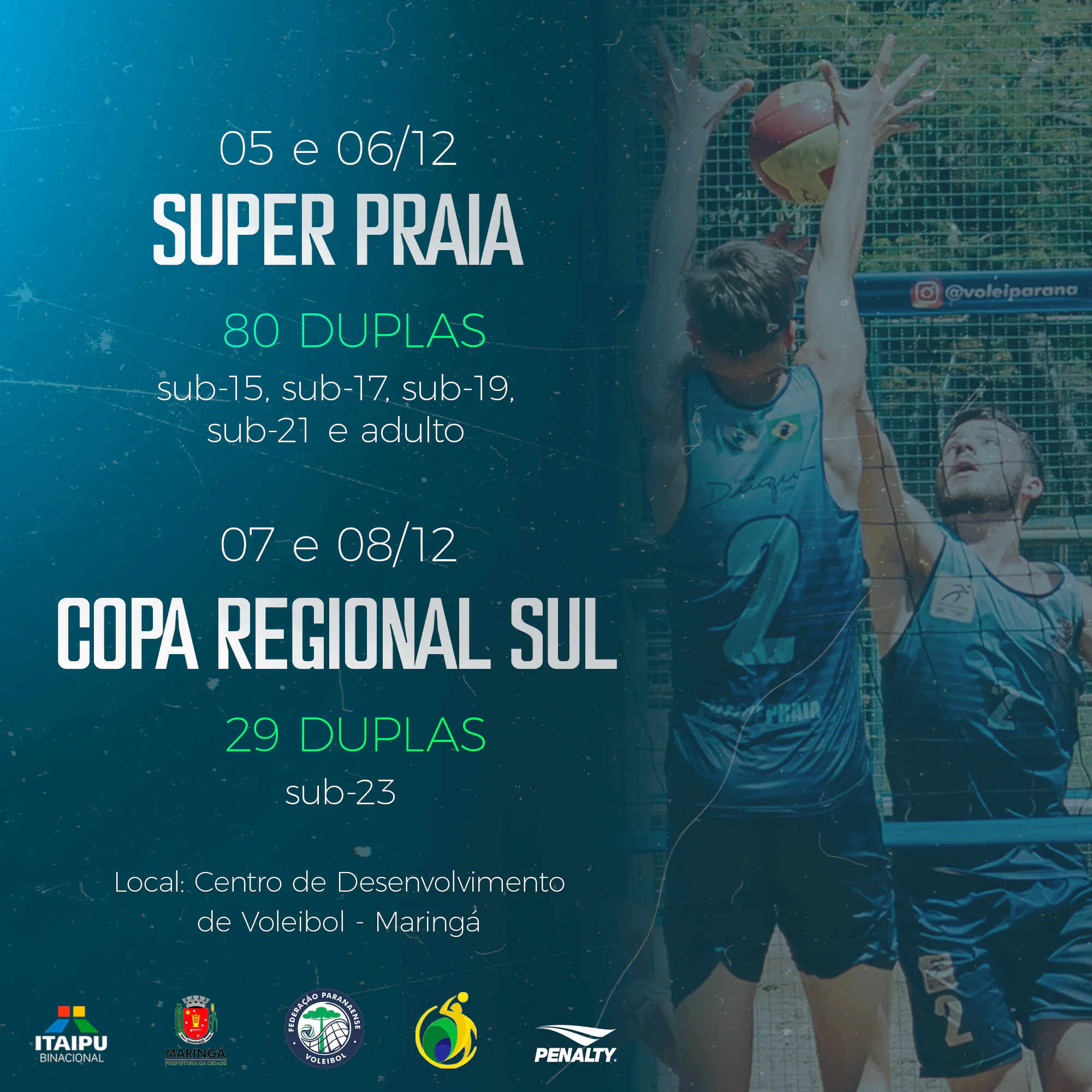 Entre os dias 5 e 8 de dezembro, Maringá será sede de duas grandes competições de vôlei de praia. As disputas na areia começam com o Super Praia, evento que reúne as oito melhores duplas do estado nas categorias Sub-15, Sub-17, Sub-19, Sub-21e Adulto. Em seguida, 58 atletas do Paraná, Santa Catarina e Rio Grande do Sul se enfrentam pela Copa Regional Sul. Os jogos serão realizados no Centro de Desenvolvimento de Voleibol.