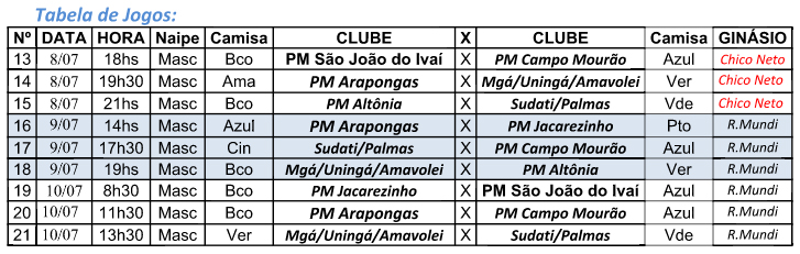 Domingo os jogos começam às 8h30 com o duelo entre Jacarezinho e São João do Ivaí. Às 11h30 será a vez de Arapongas e Campo Mourão. Fechando a etapa classificatória, os donos da casa enfrentam o time de Palmas, no jogo que pode definir o primeiro colocado. A primeira etapa do Estadual Adulto da primeira divisão foi disputada em Palmas, no sudoeste do Estado, em maio.