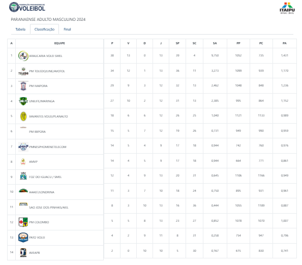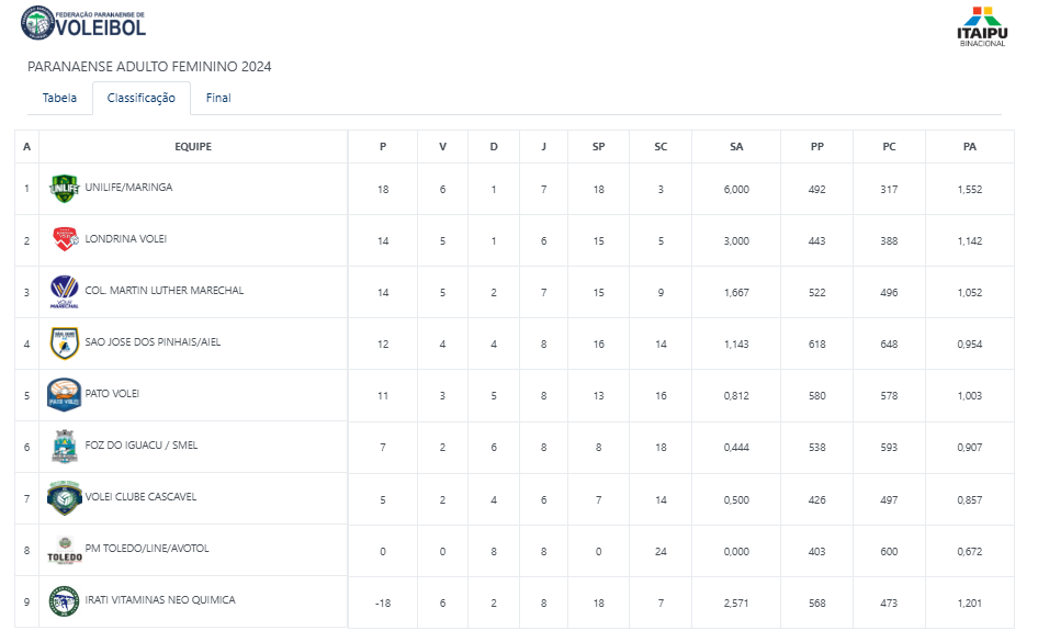 Atualmente, o Unilife/Maringá lidera a tabela de classificação com 18 pontos, seguido por Londrina Vôlei e Vôlei Marechal, ambos com 14 pontos.