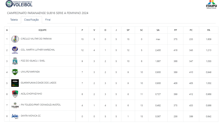 Confira a atual a classificação do feminino Sub-16, Série A: TABELA E RESULTADOS