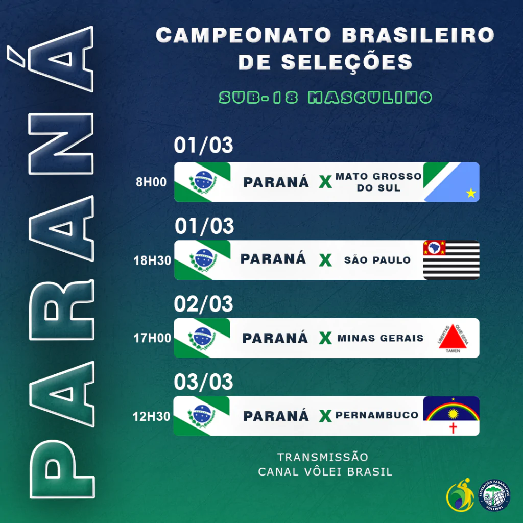 Pelo Grupo B, Paraná estreia na competição logo no primeiro jogo da rodada. Nesta terça-feira (01), às 8h00, nossos atletas entram em quadra contra a Seleção do Mato Grosso do Sul. No mesmo dia, às 18h30, Paraná fecha a rodada enfrentando São Paulo.