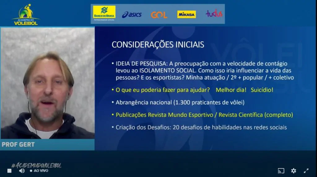 Após as introduções, o professor Gert explicou o sistema da pesquisa criada durante a pandemia. Ele realizou contato com treinadores de diversas regiões do país buscando praticantes acima dos 18 anos, que não fossem atletas profissionais e que praticassem voleibol regularmente (no mínimo uma vez por semana). O questionário foi respondido de maneira virtual e contou com cerca de 1,3 mil participantes.