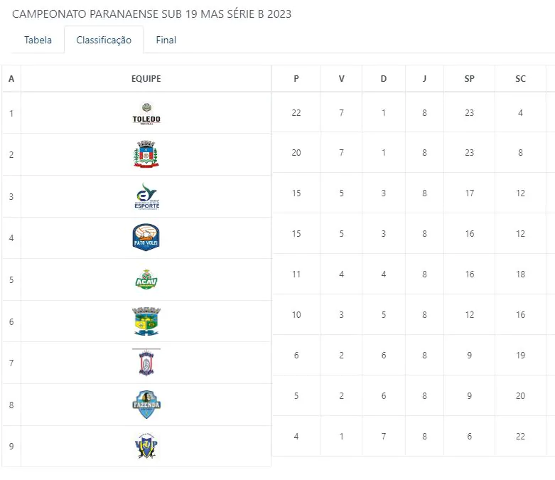Veja como ficou a classificação após duas etapas do Campeonato Paranaense Sub-19 Série B masculino: